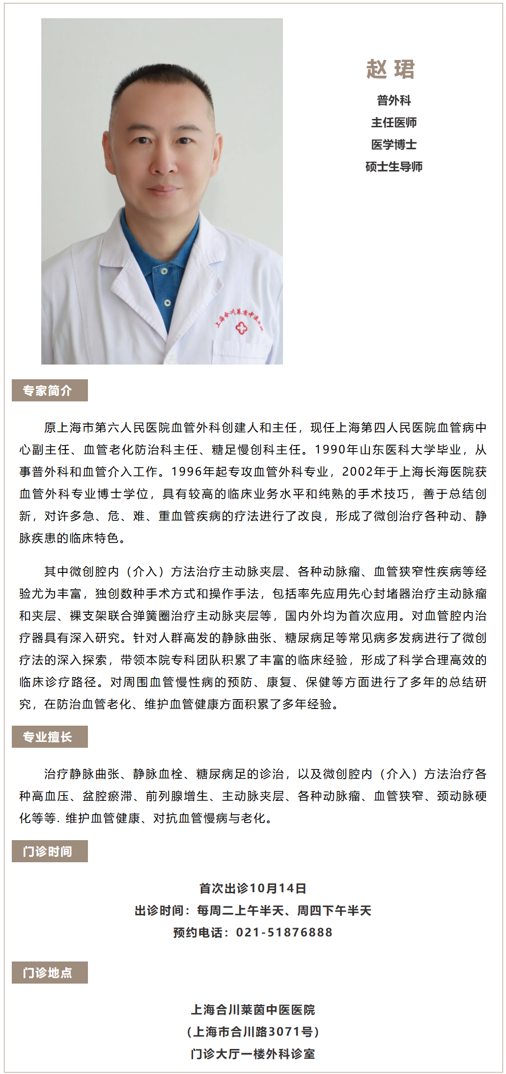 【血管外科专家】上海第四人民医院血管病中心赵珺博士,每周到我院定期坐诊,专注静脉曲