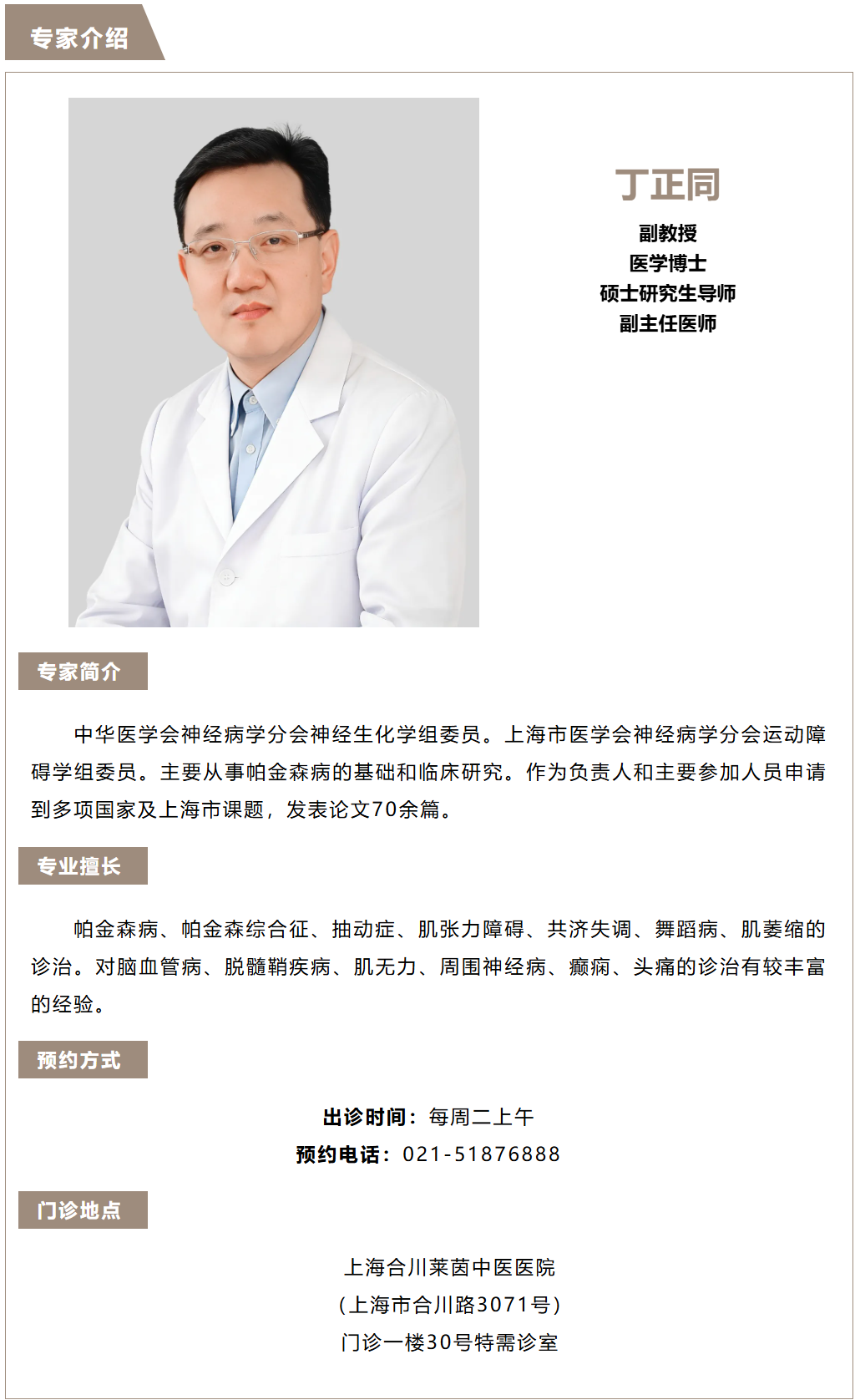 【专家医讯】上海华山医院神经内科副主任医师丁正同博士,每周二上午来我院坐诊!